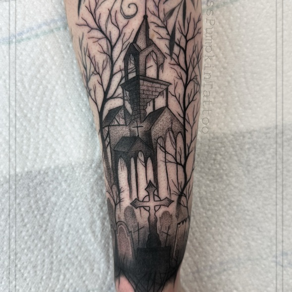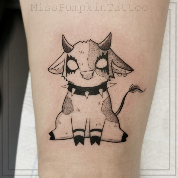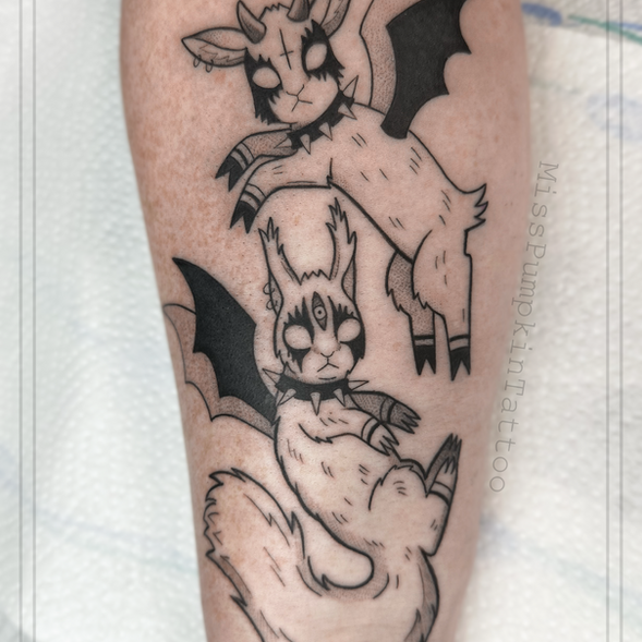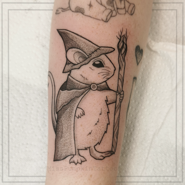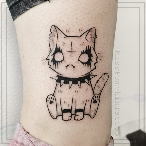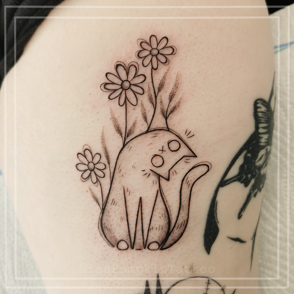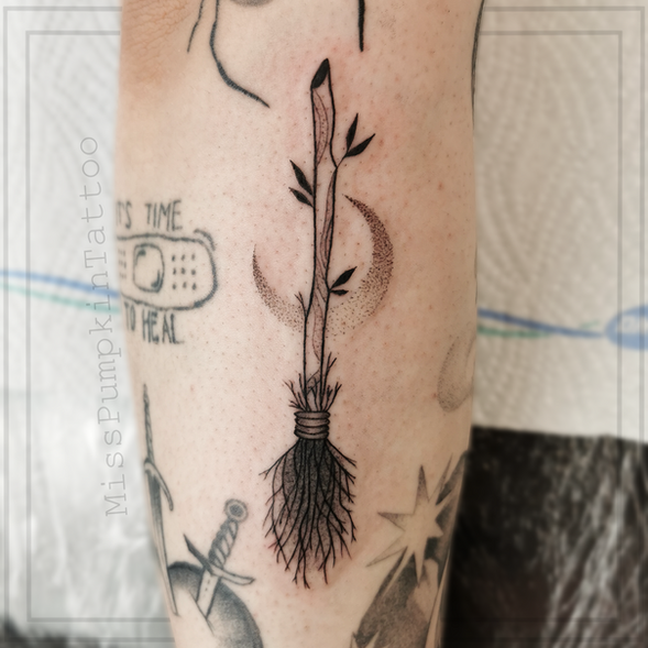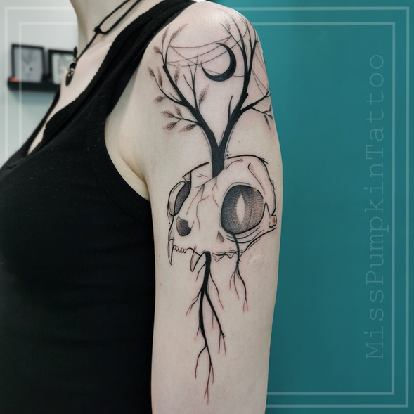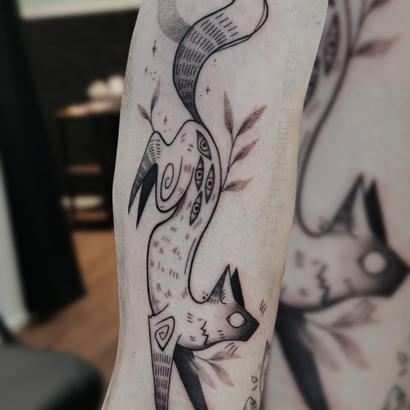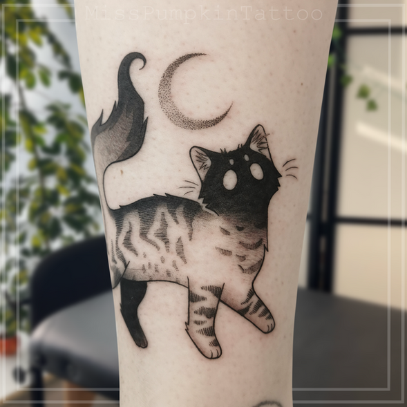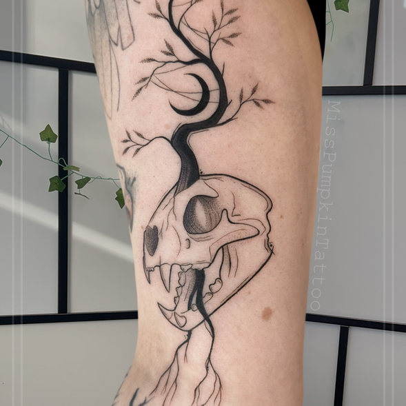 Ich arbeite gerne im Stil "Fineline" und "Dotwork" und bevorzuge Schwarz mit maximal ein paar Farbakzenten. Ich liebe Katzen, Dinos, mystische Tiere und zarte florale Muster. Darüber hinaus beinhalten meine Motive auch gerne mal ein Paar extra Augen. Ich würde sagen meine Motive lassen sich ganz gut als "witchy", "etwas düster" und trotzdem "irgendwie niedlich" bezeichnen.